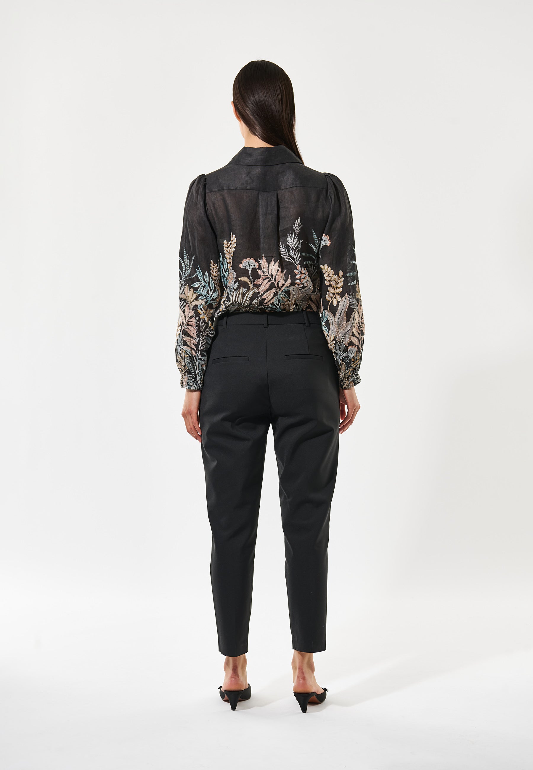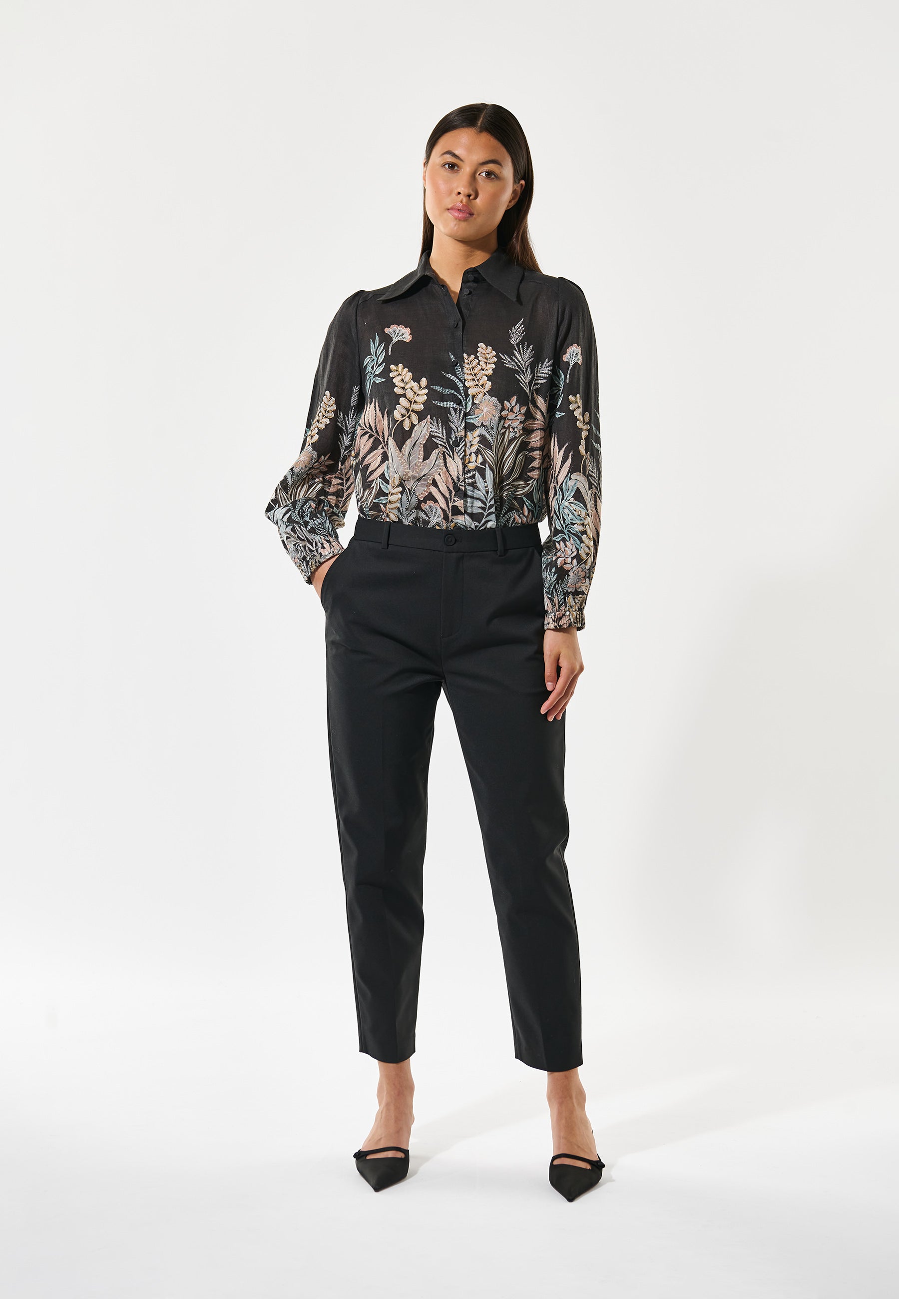 Smuk hørskjorte med et skønt vintageprint. Skjorten har krave, klassisk bærestykke på skulderen, brede ærmer med elastikmanchet og fine betrukne knapper.