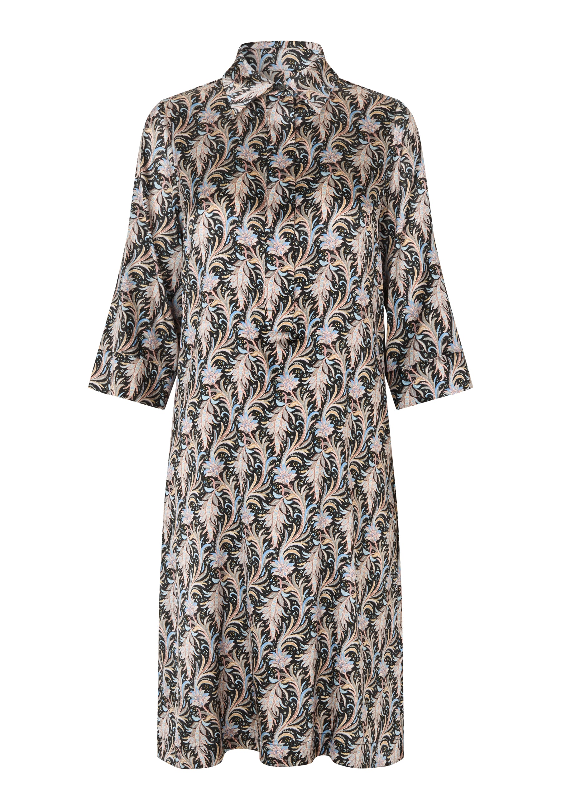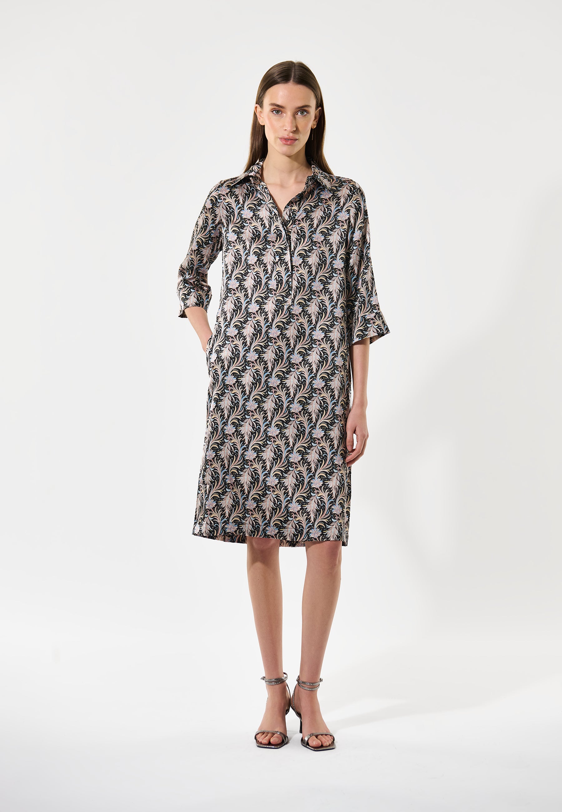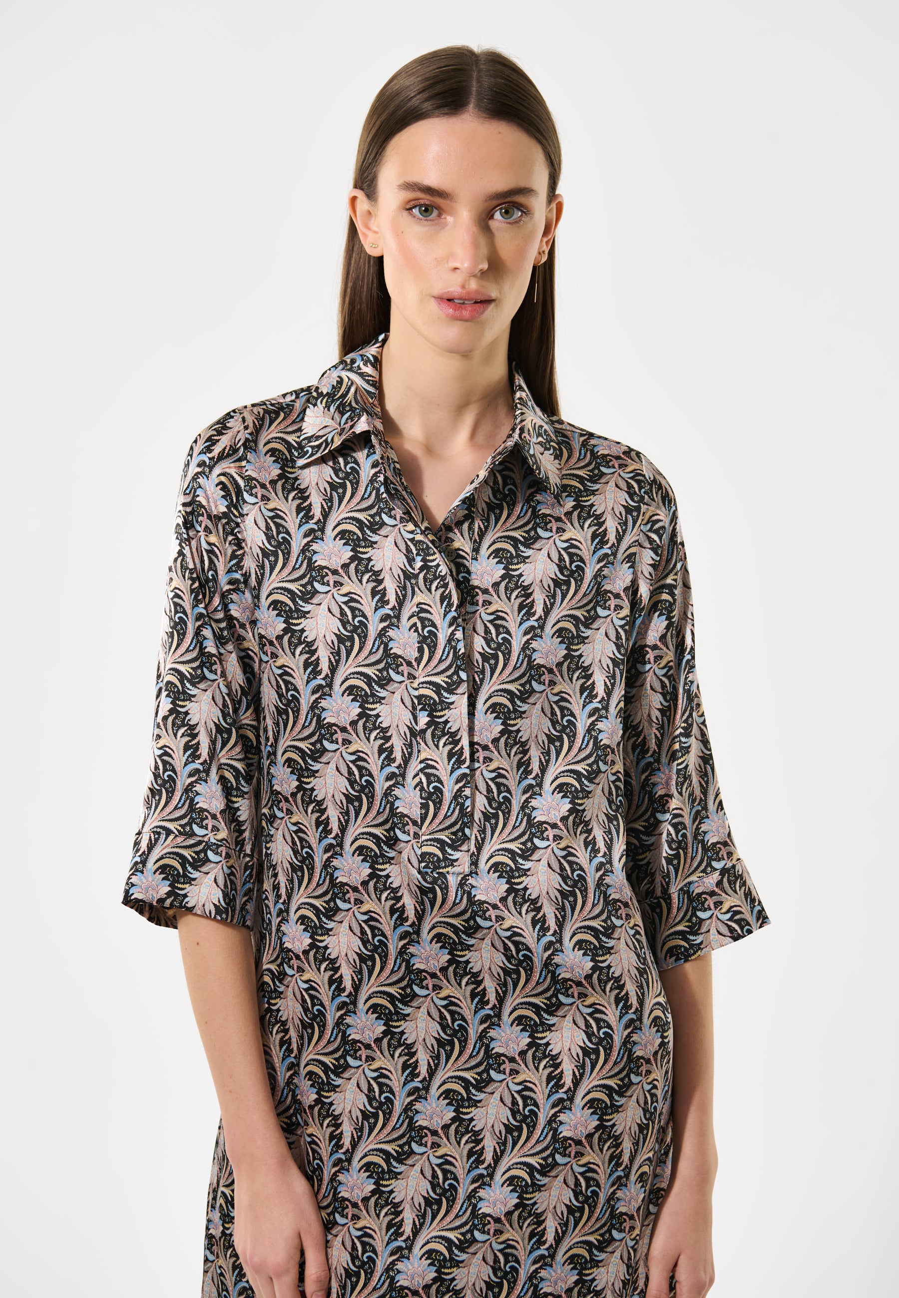 Smuk silketunika kjole i smukt abstrakt blomster print i skønne pastel farver på sort bund. Kjolen har klassisk skjortekrave, stolpelukning med knapper og trekvartærme med manchet. Hvis du har været glad for Kamillesdea kjolen, er denne nye style helt sikkert noget for dig.