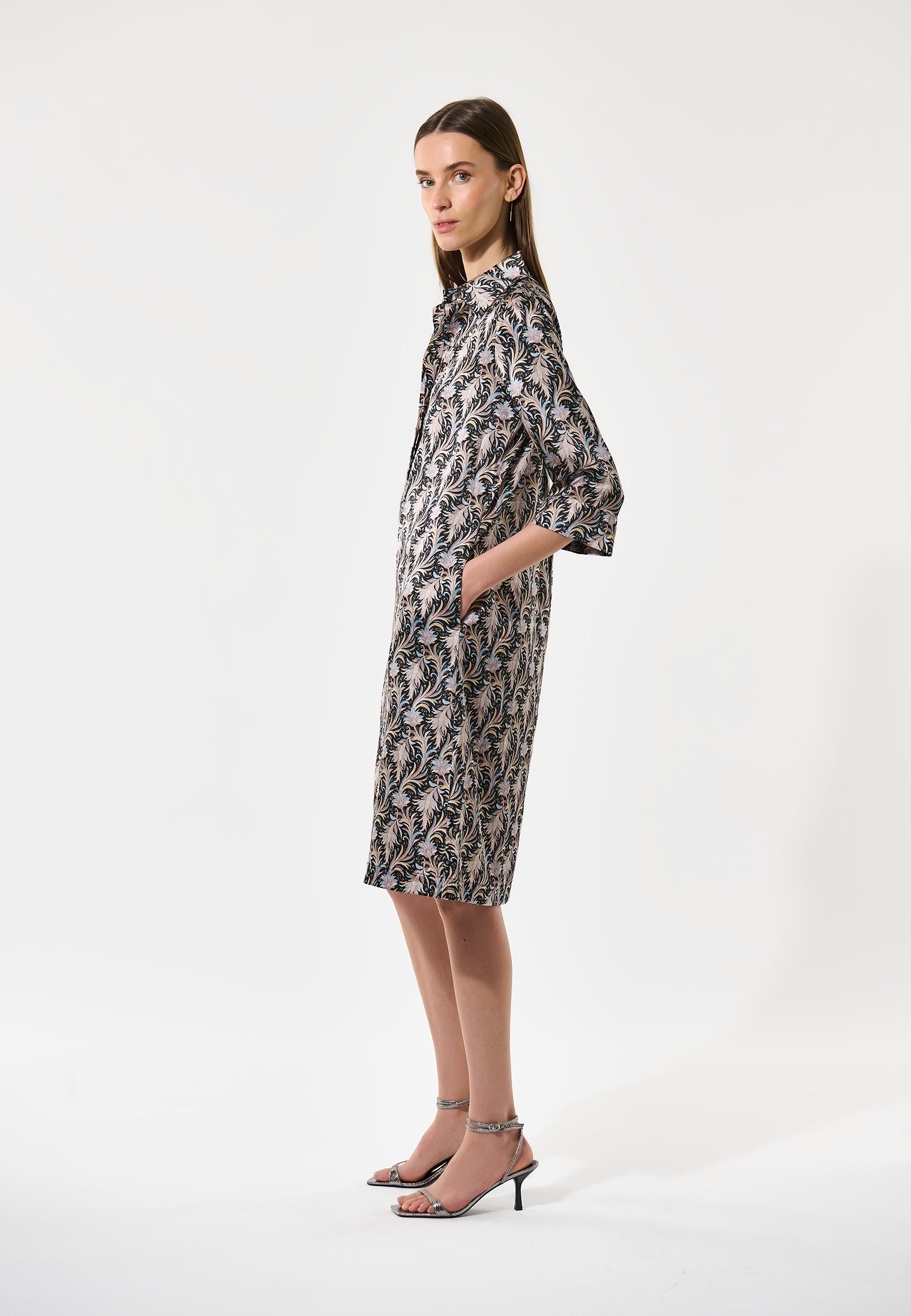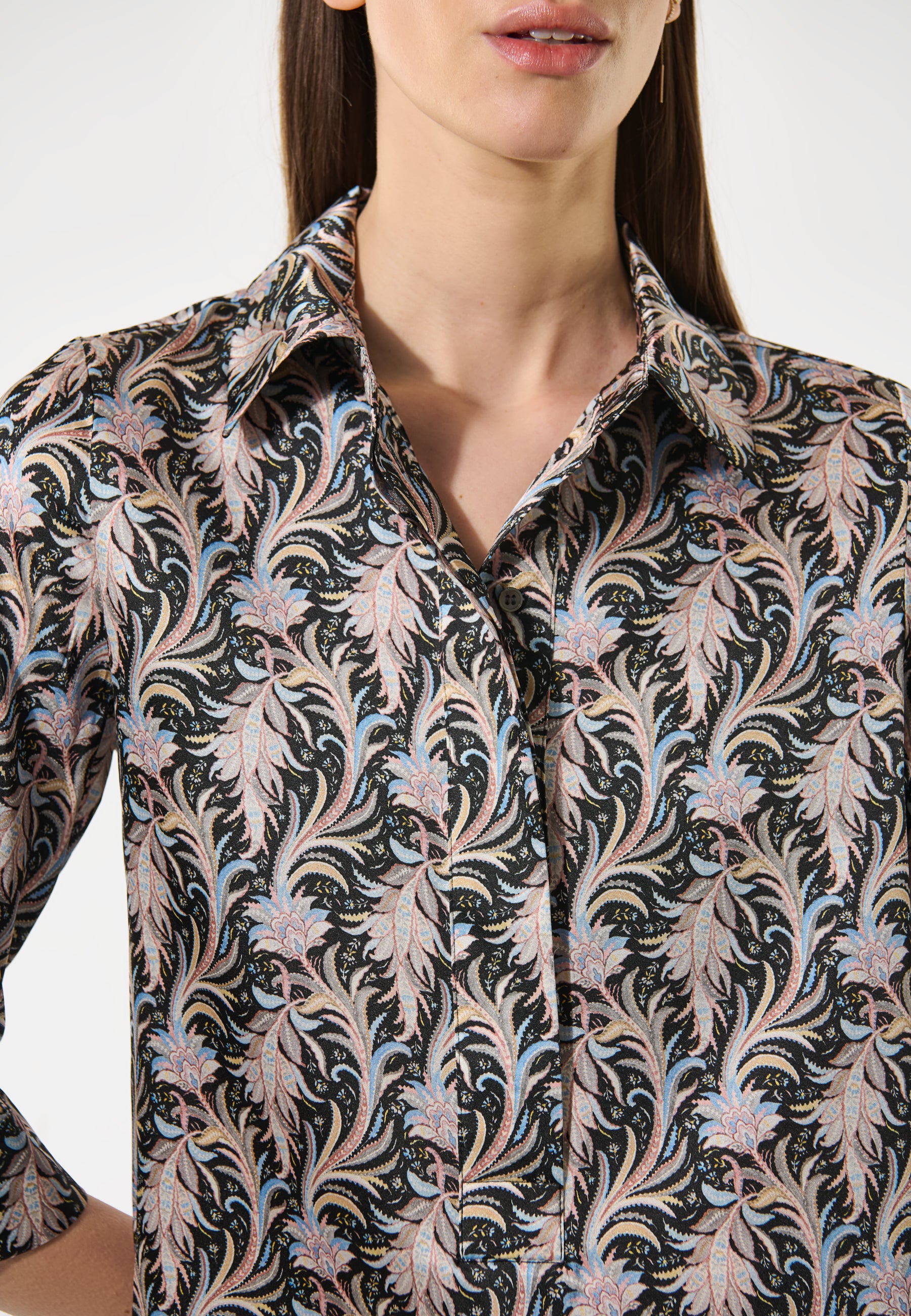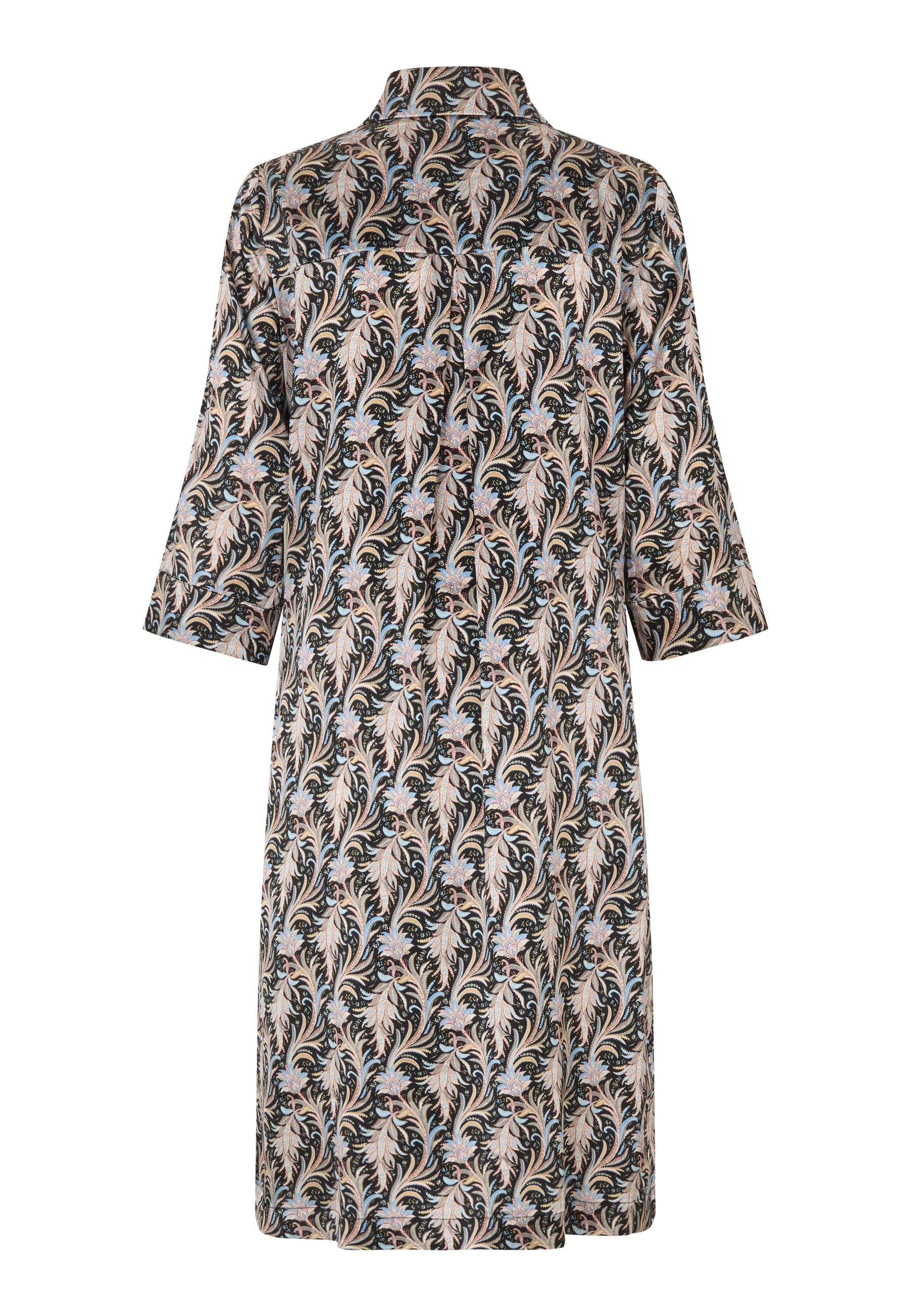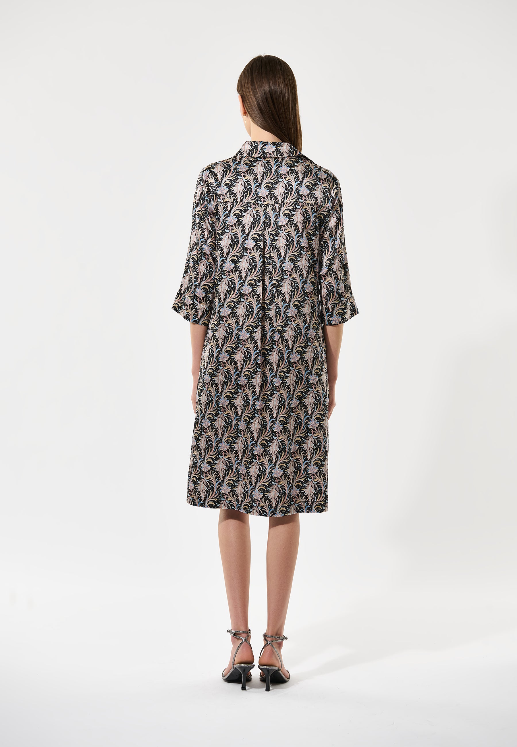 Smuk silketunika kjole i smukt abstrakt blomster print i skønne pastel farver på sort bund. Kjolen har klassisk skjortekrave, stolpelukning med knapper og trekvartærme med manchet. Hvis du har været glad for Kamillesdea kjolen, er denne nye style helt sikkert noget for dig.