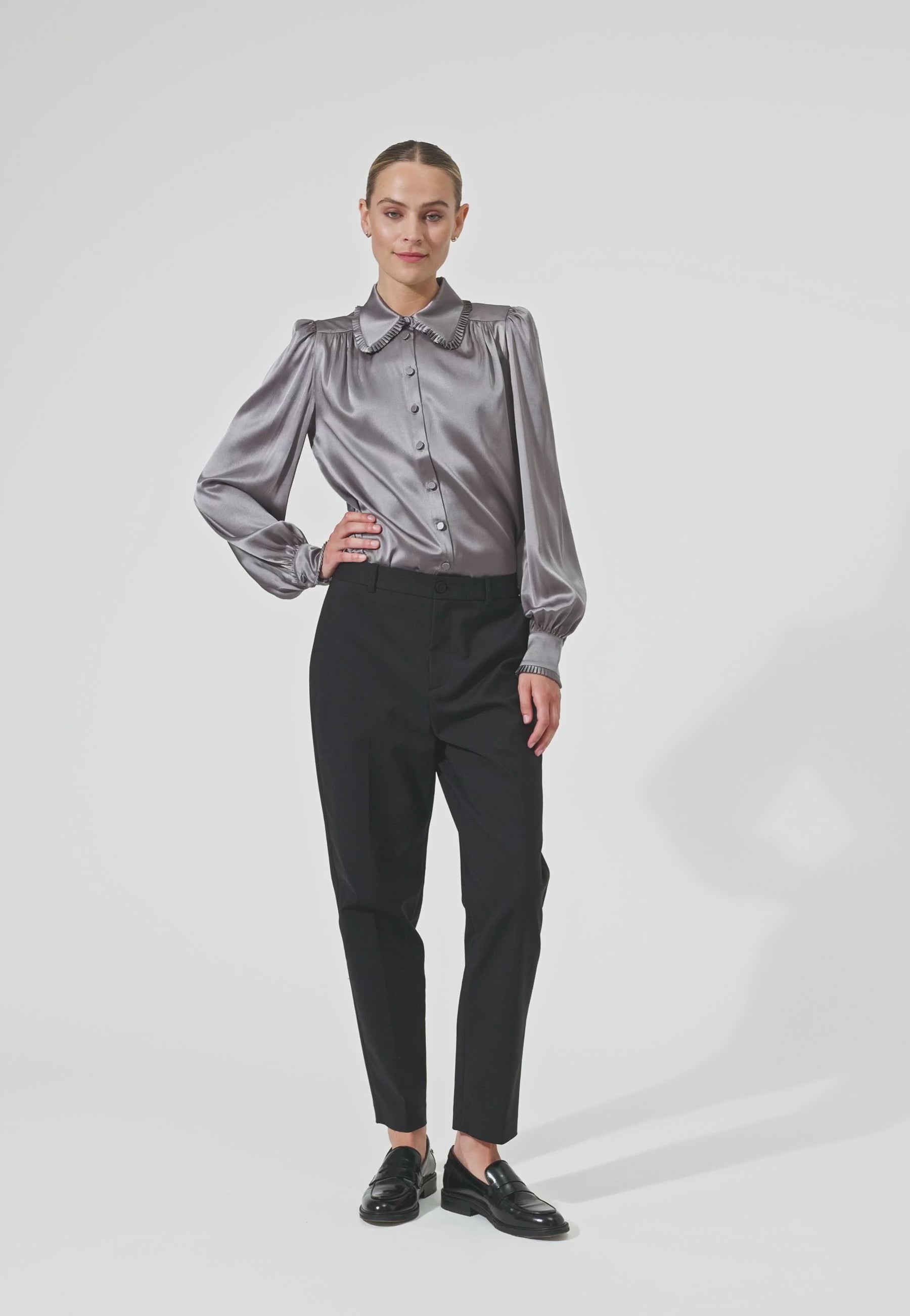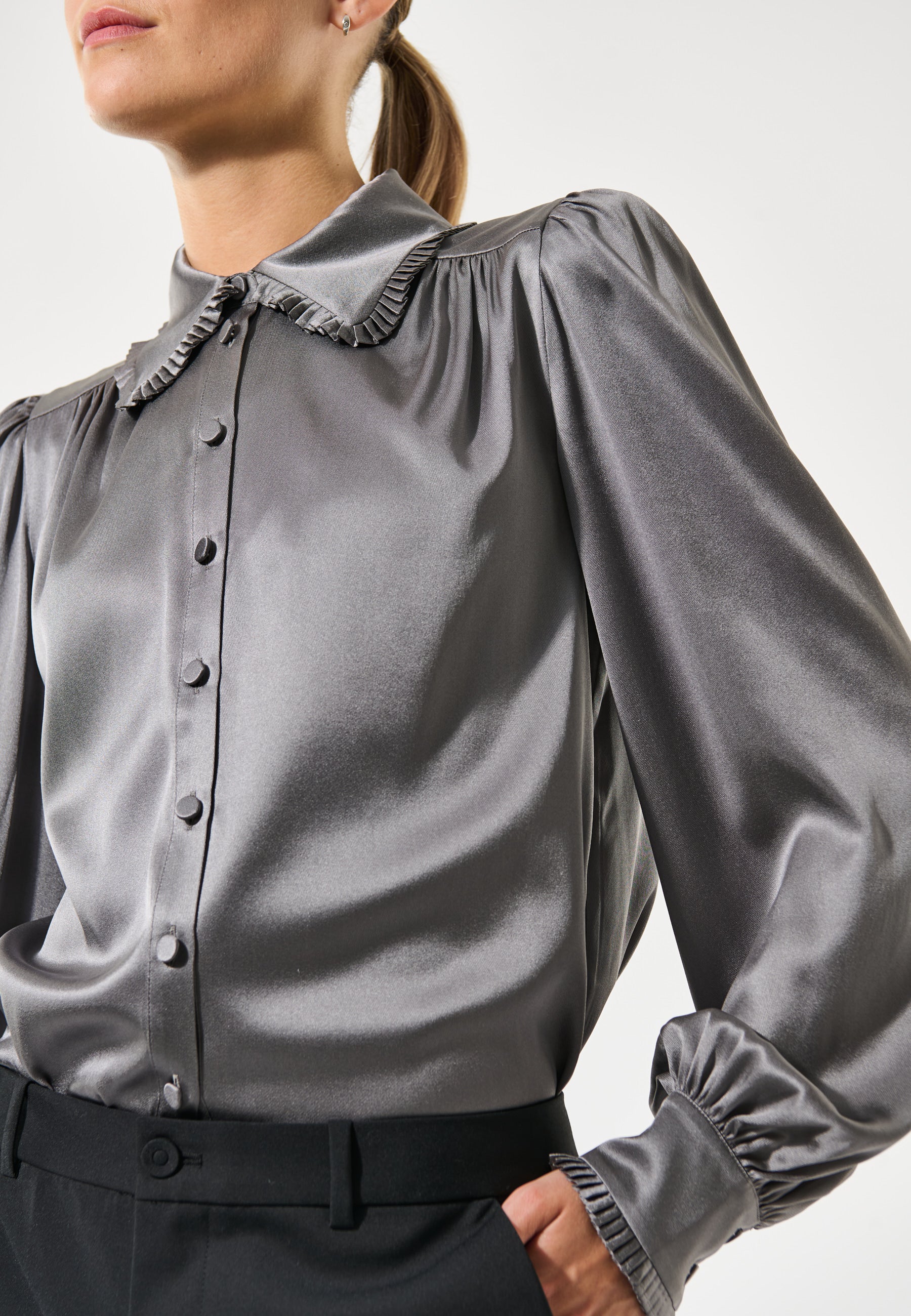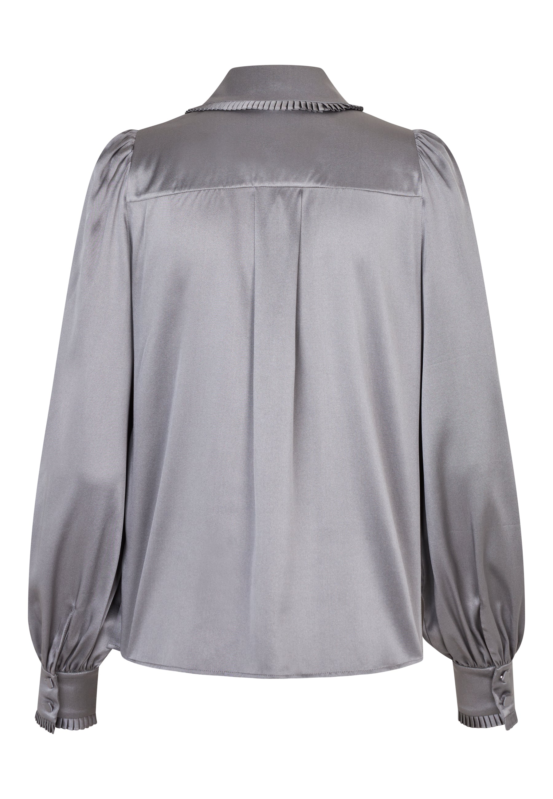 Skøn gennemknappet silkeskjorte i smuk grå silke. Sjorten har klassisk skjortekrave og klassisk manchet begge med smal, tæt flæsekant.