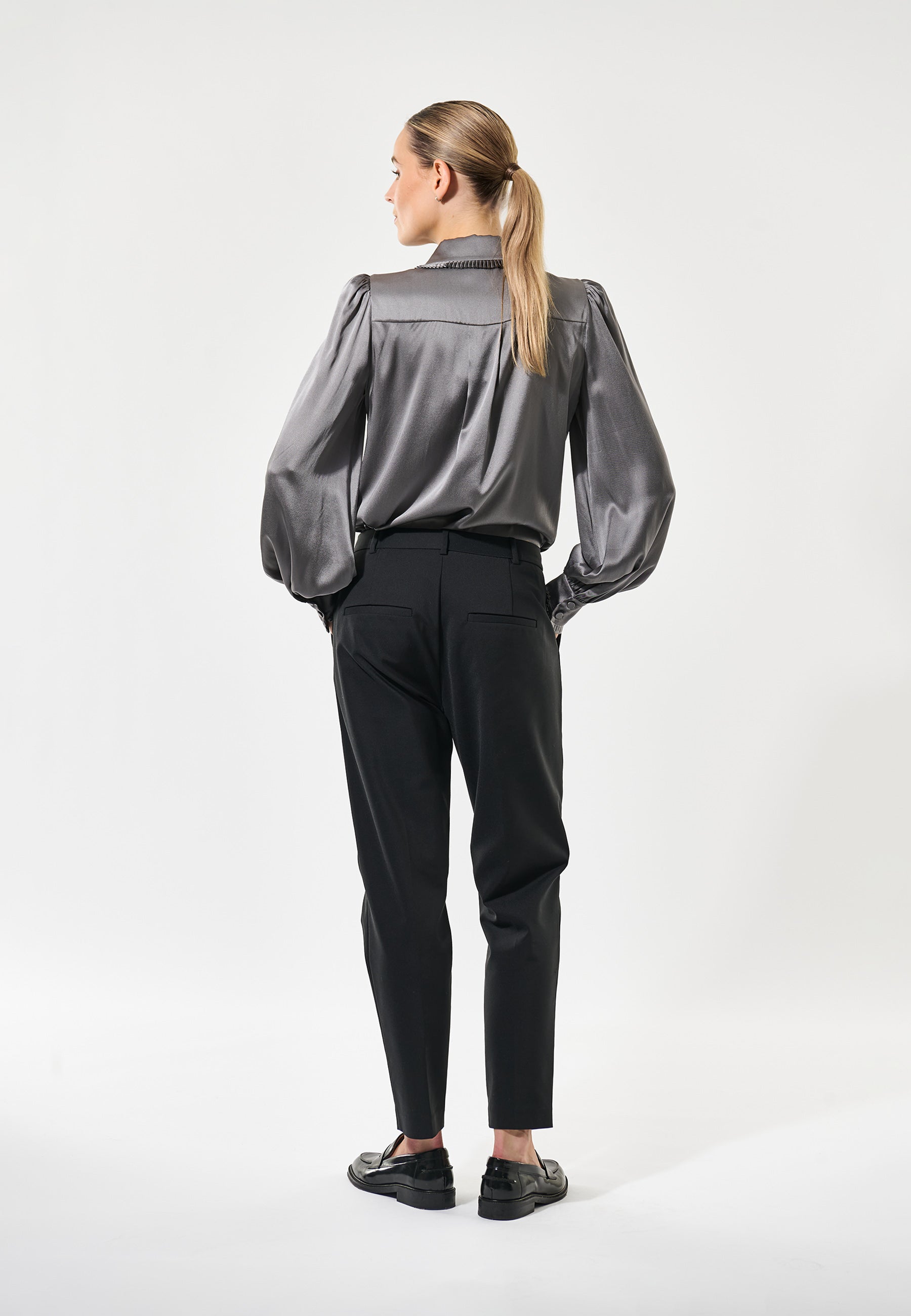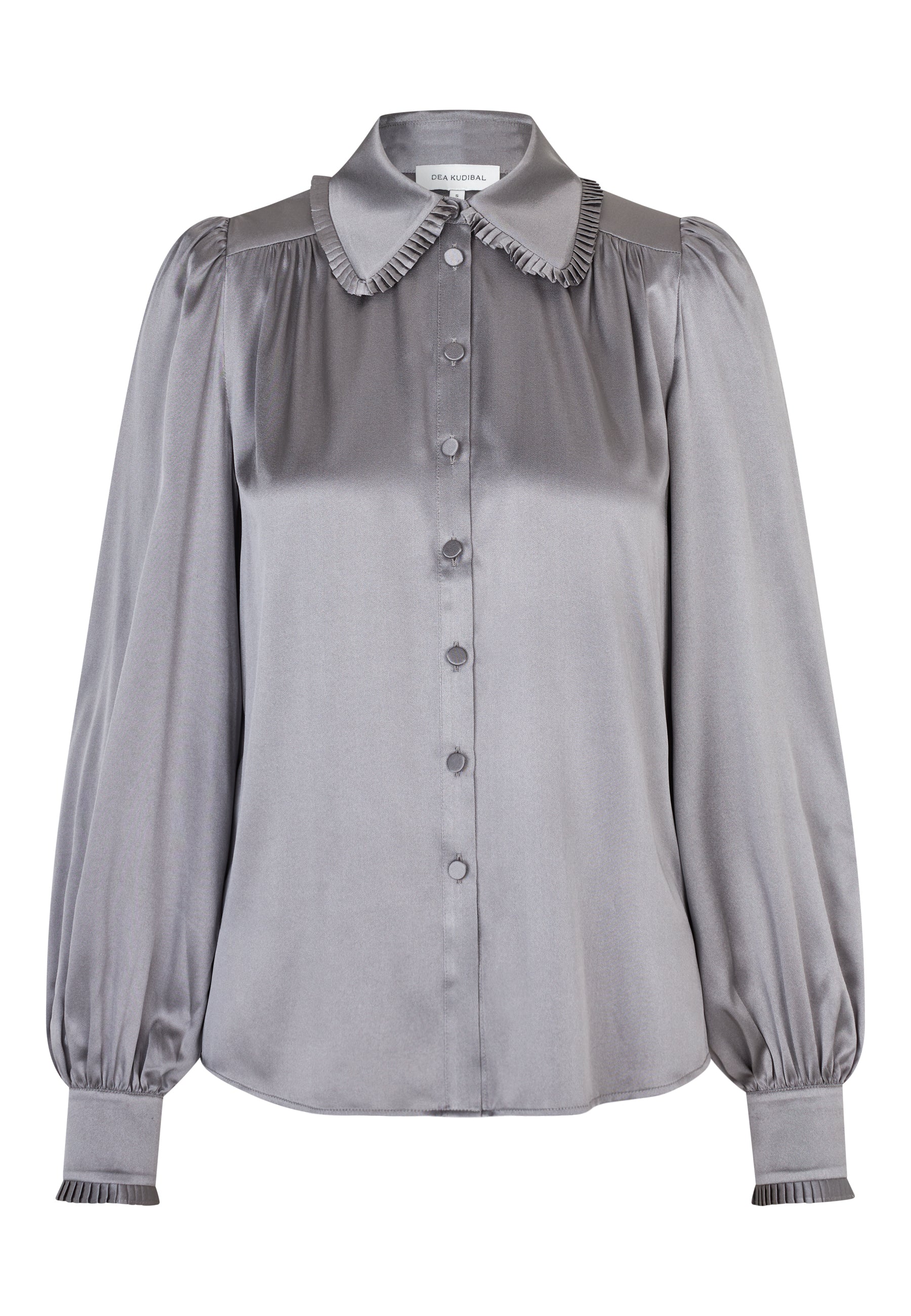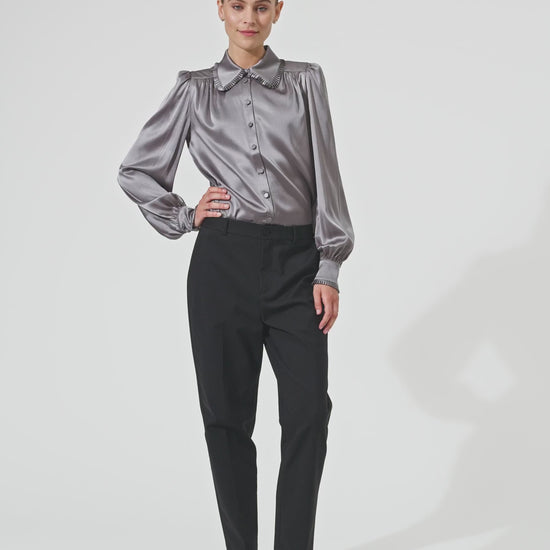 Skøn gennemknappet silkeskjorte i smuk grå silke. Sjorten har klassisk skjortekrave og klassisk manchet begge med smal, tæt flæsekant.