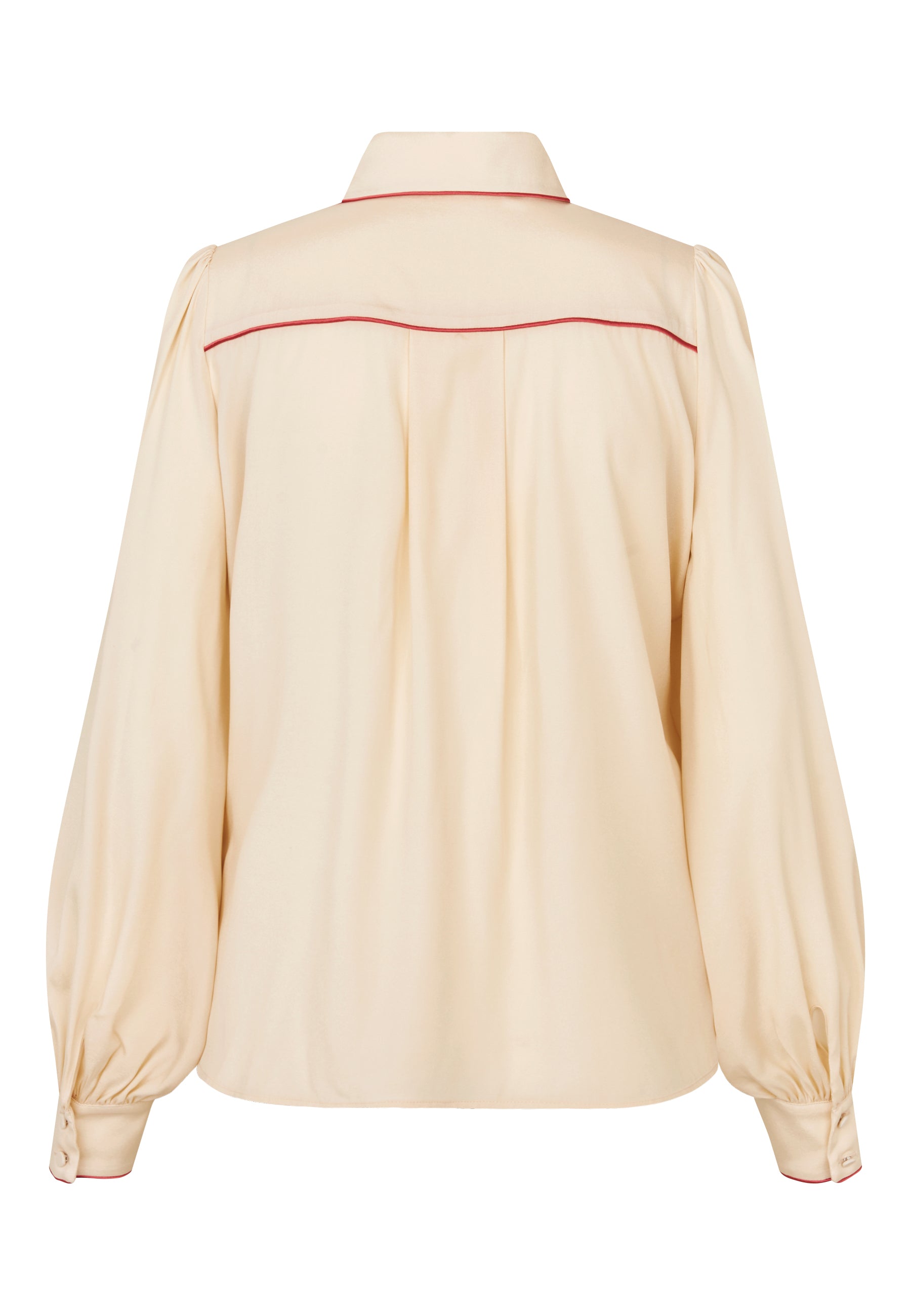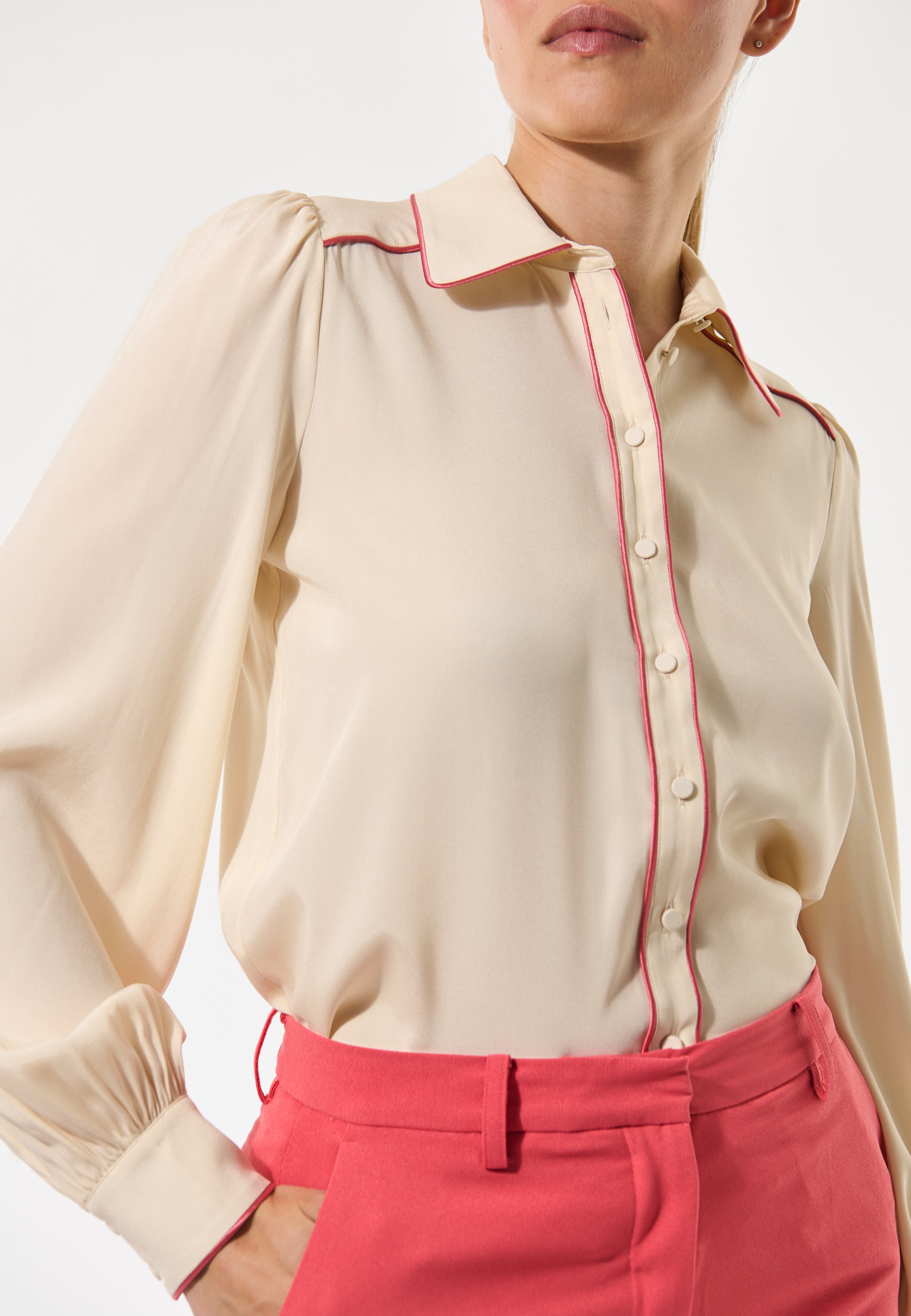 Skøn gennemknappet skjorte i et klassisk pyjamas skjorte-look. Skjorten har skjortekrave, bærestykke, manchet og fine hindbærfarvede piping detaljer.