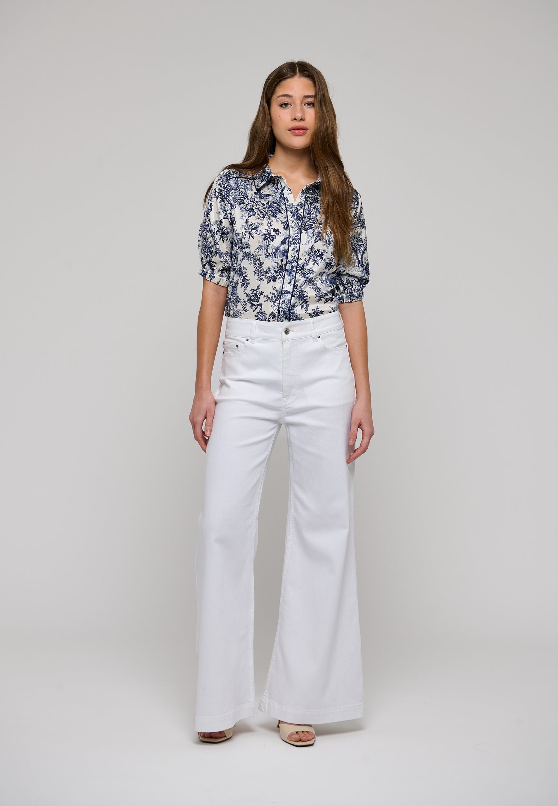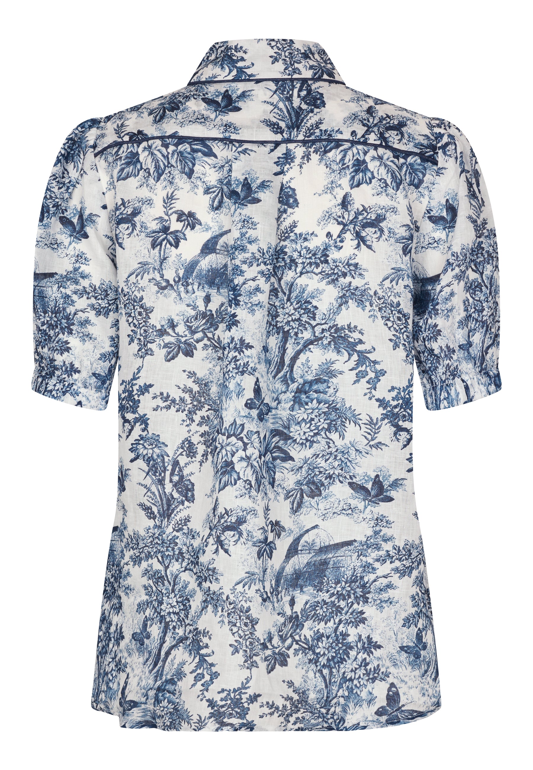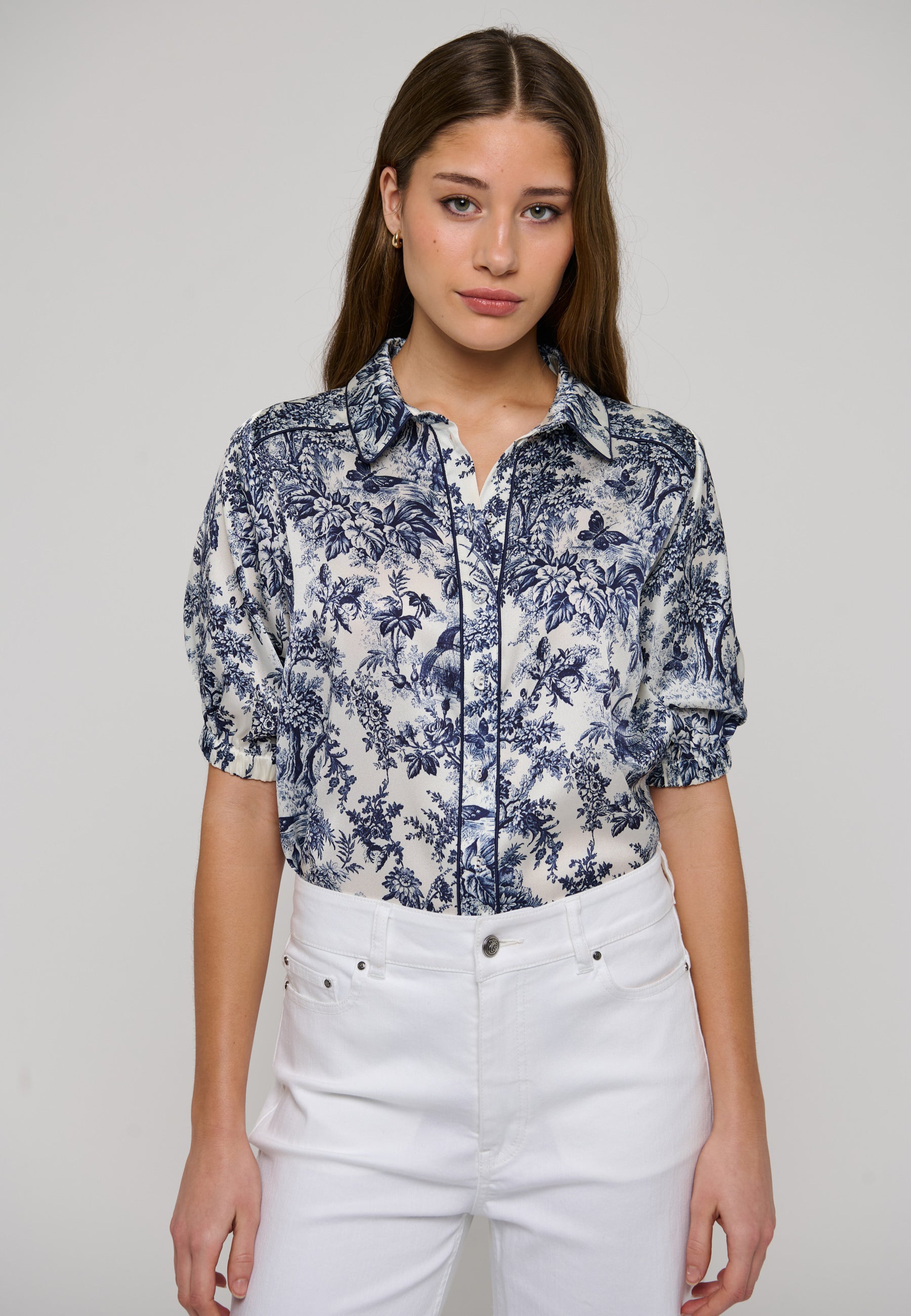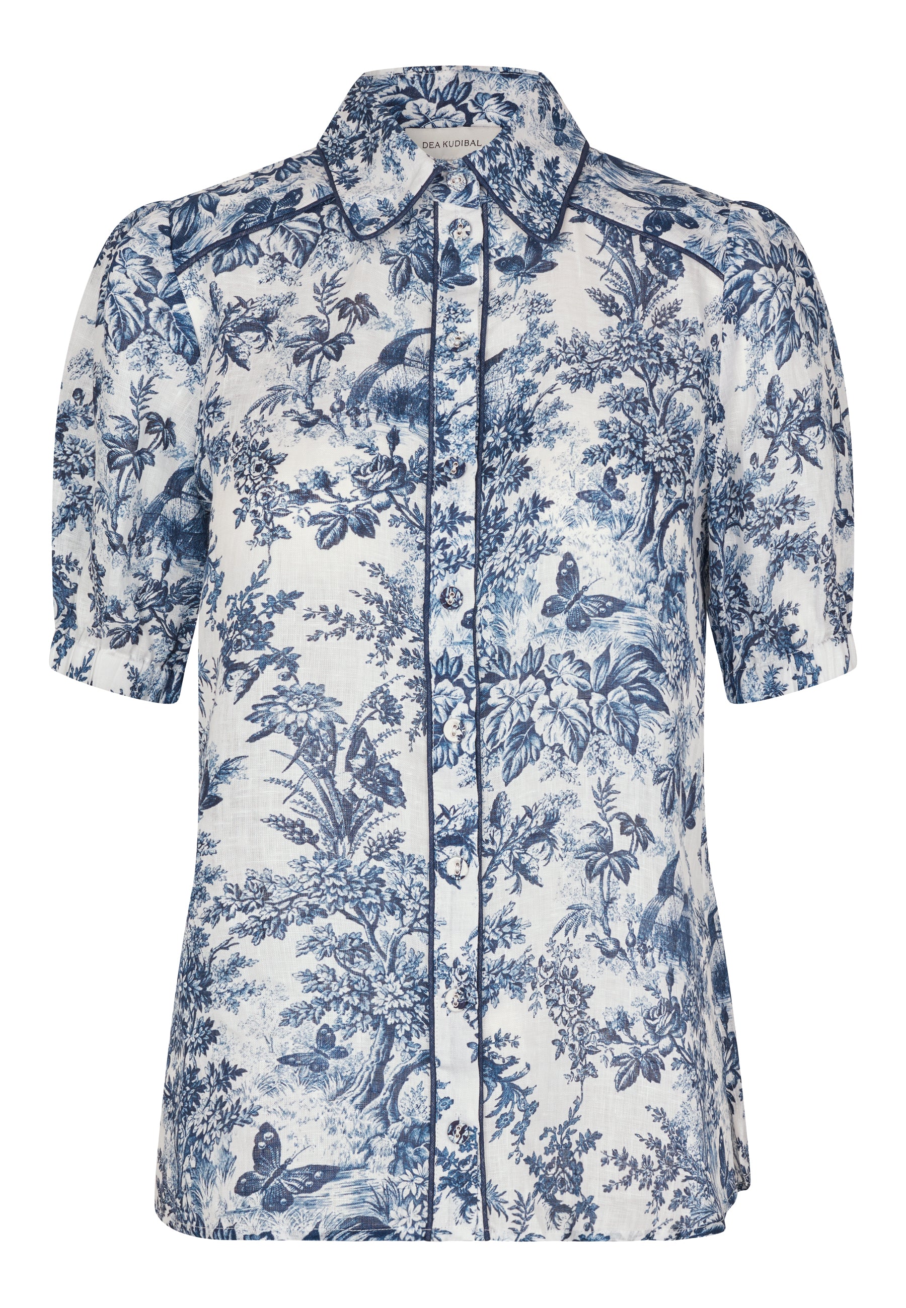 Violetadea er en kortærmet feminin bluse med et lækkert 'loose fit' Violetta har en klassisk skjortekrave med fine rundede kanter og pipping detaljer. Fortil lukkes den med betrukne knapper, bagpå har den et wienerlæg som giver den en eksklusiv fylde i ryggen. Ærmerne er korte, med et lille puf og en løs elastik manchet.
