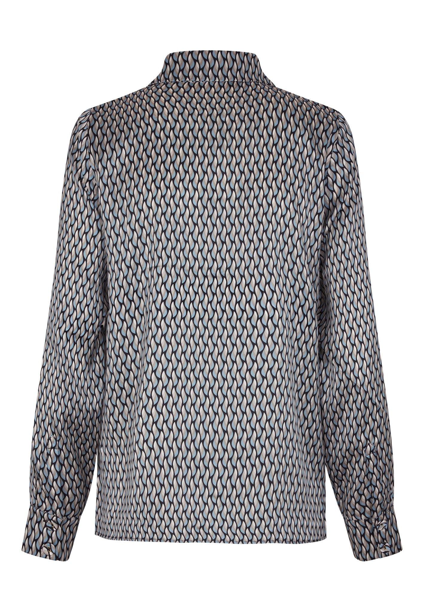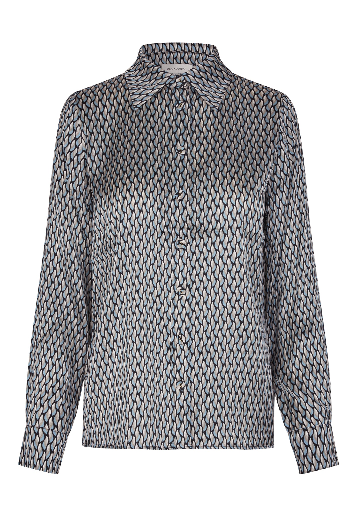 Skøn tunika i lækker viscose crepe med fine piping detaljer fortil og på bærestykke. Tunikaen har en enkel rund halsudskæring, stolpelukning med skjulte knapper, bærestykke og løse ærme med fin rynkedetalje. Printet består af små blomster i gyldne, brune og blå nuancer på navyblå bund.