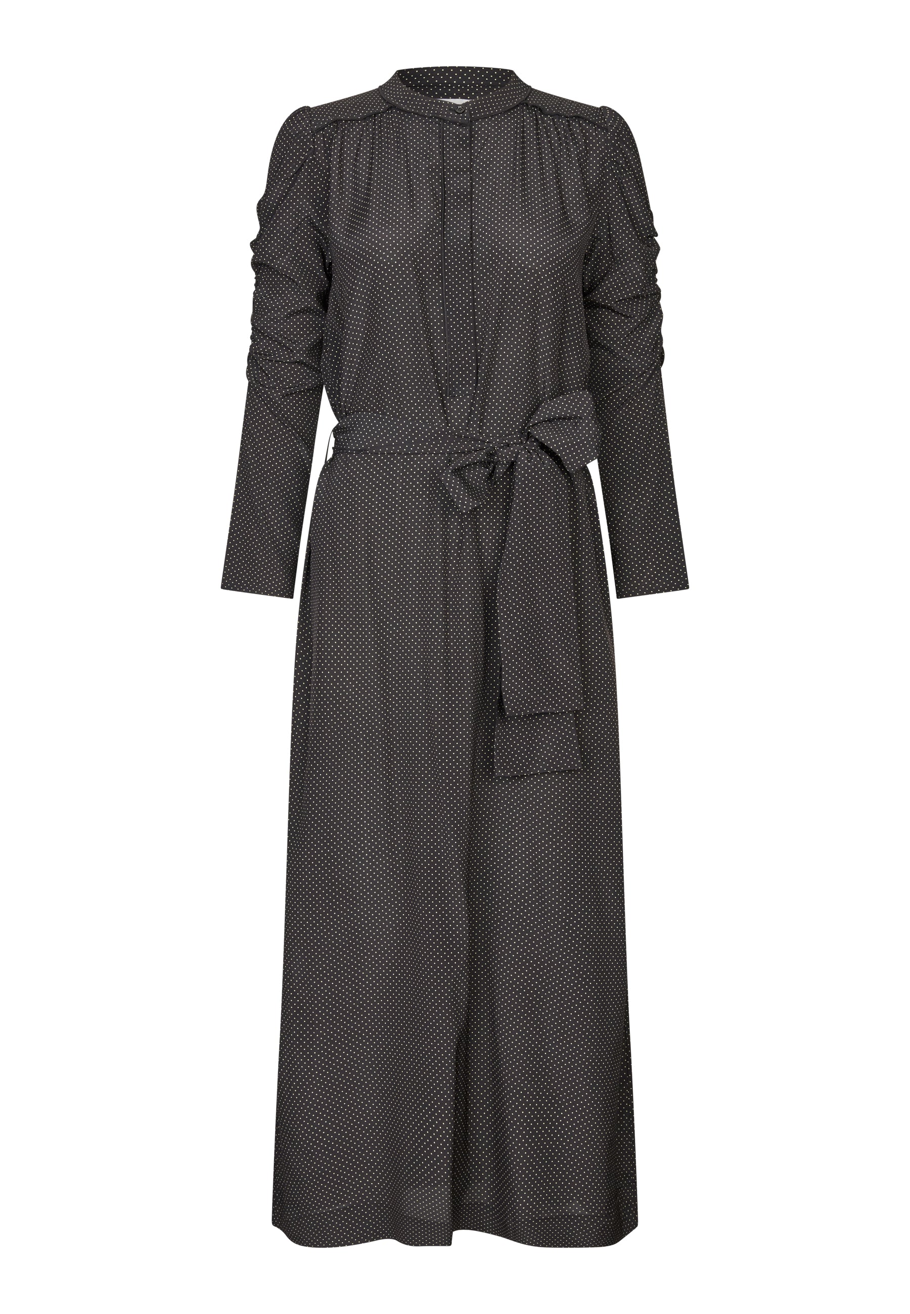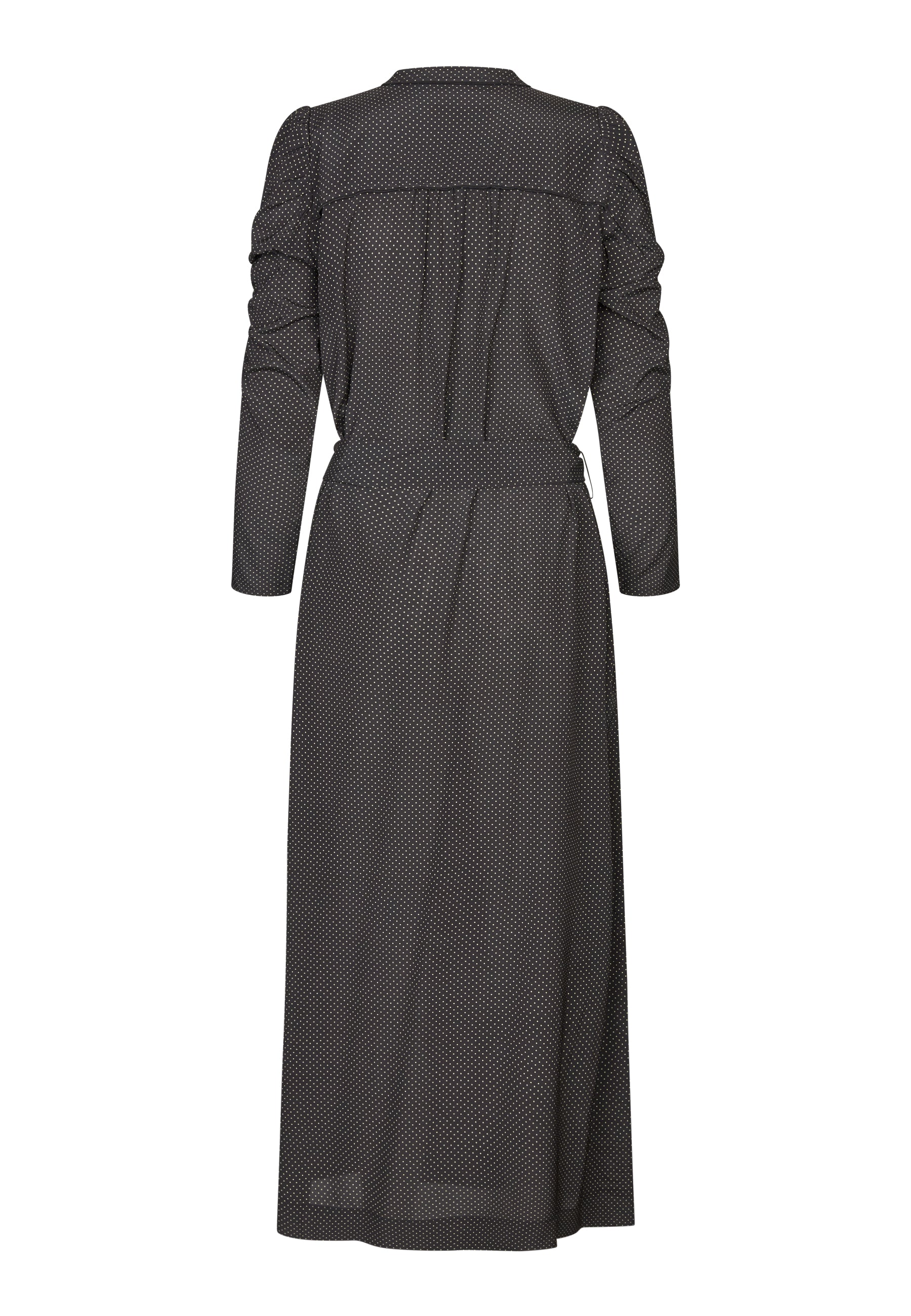Skøn lang silkekjole med fine pipping detaljer fortil og på bærestykke. Den har en enkel rund halsudskæring, stolpelukning med skjulte knapper, bærestykke og smalle ærmer med fin rynkedetalje. Til kjolen medfølger et bredt stof bindebælte. Printet består af små hvide prikker på sort bund.