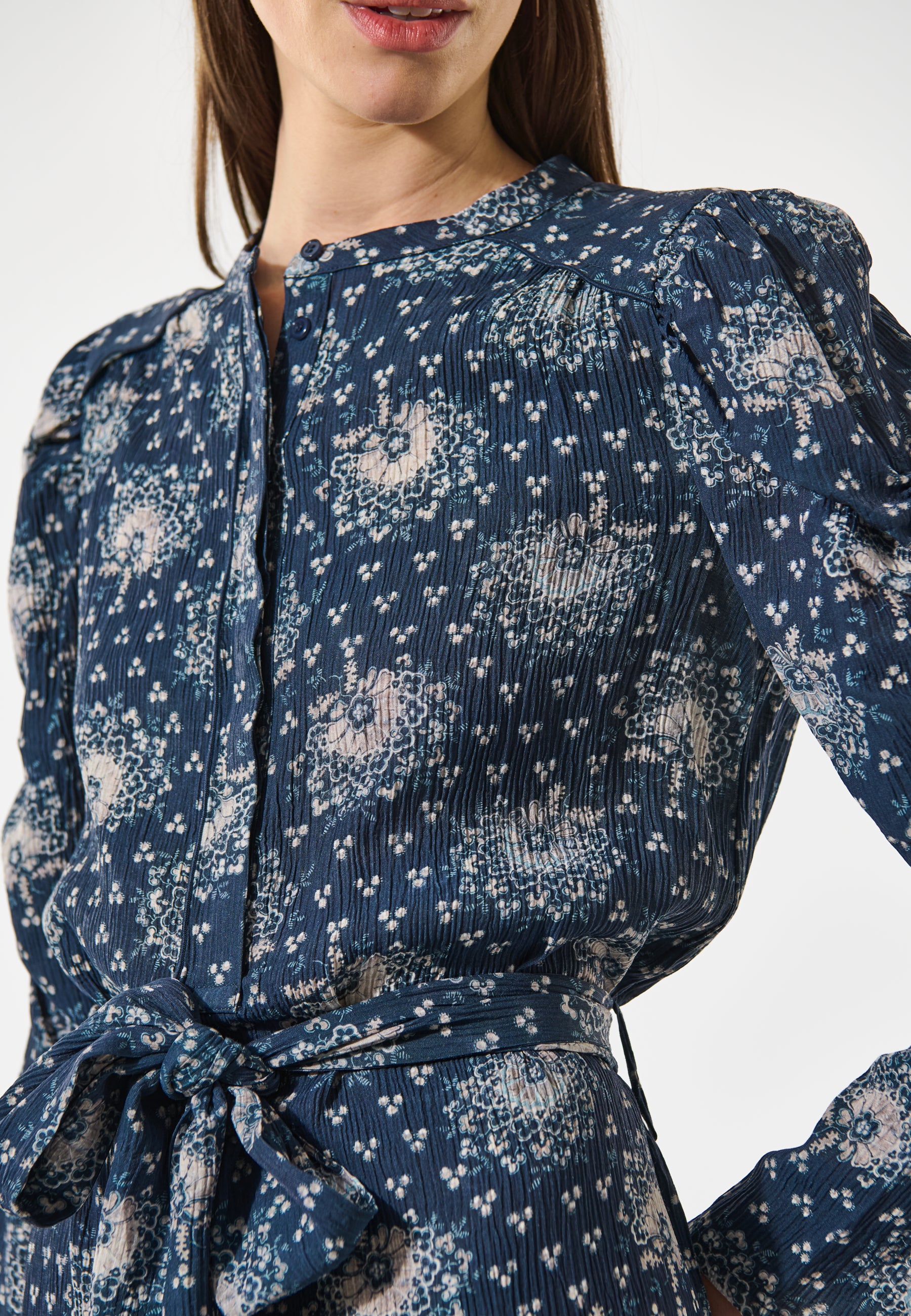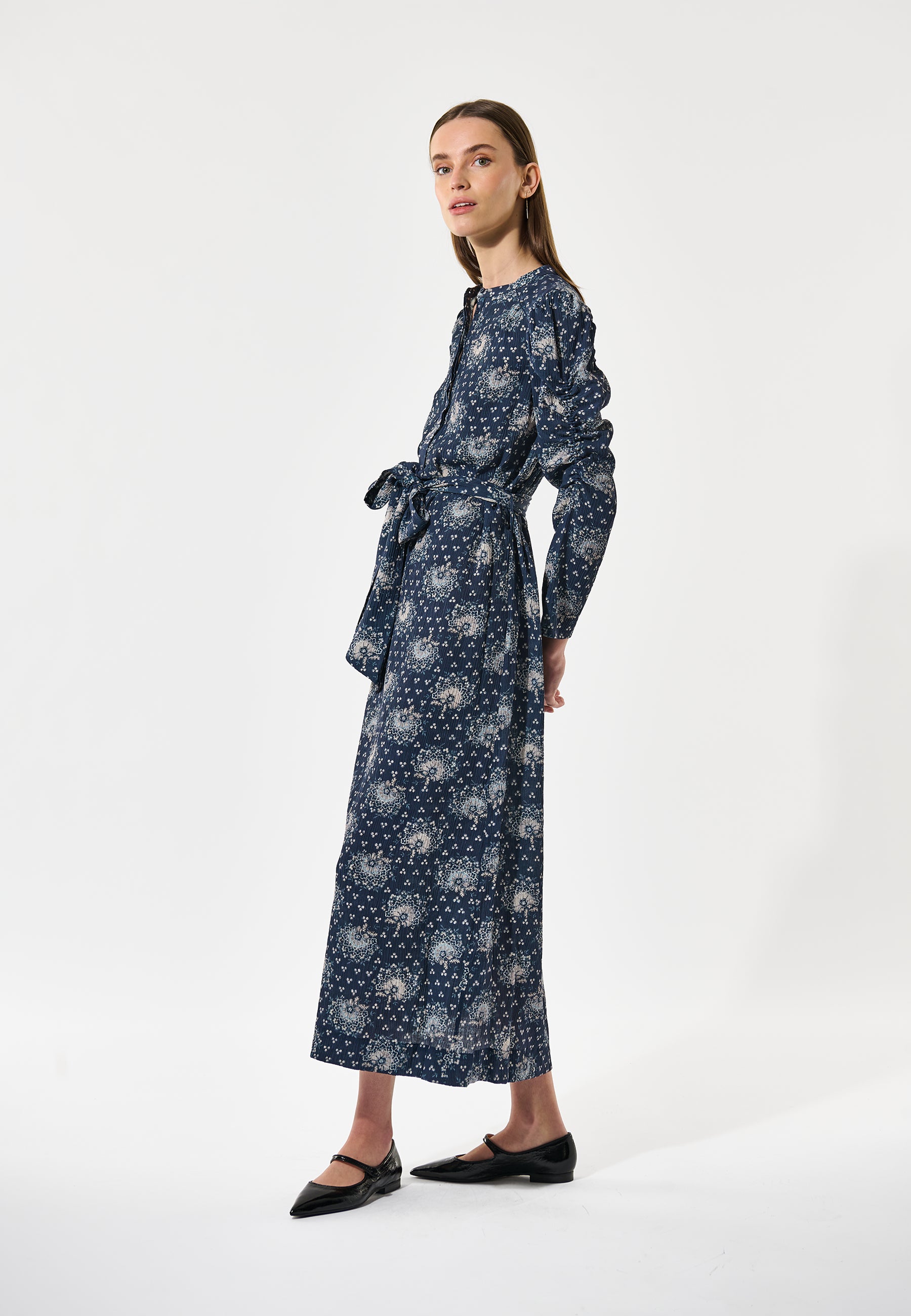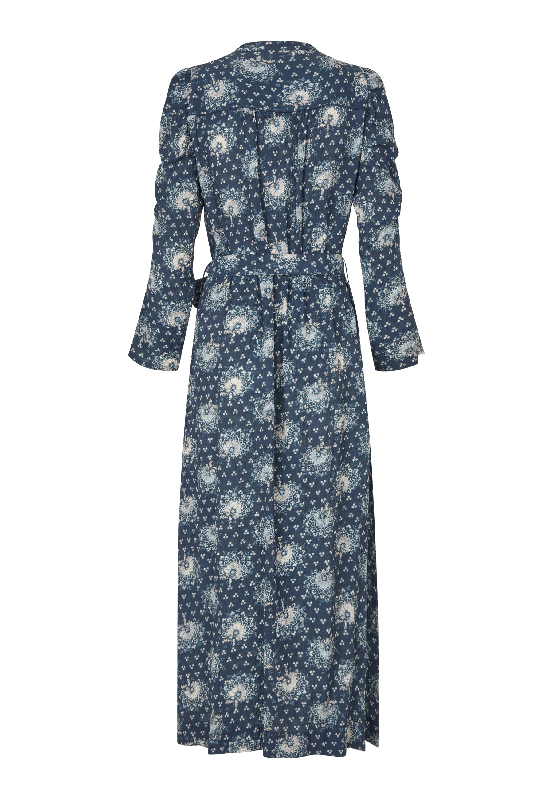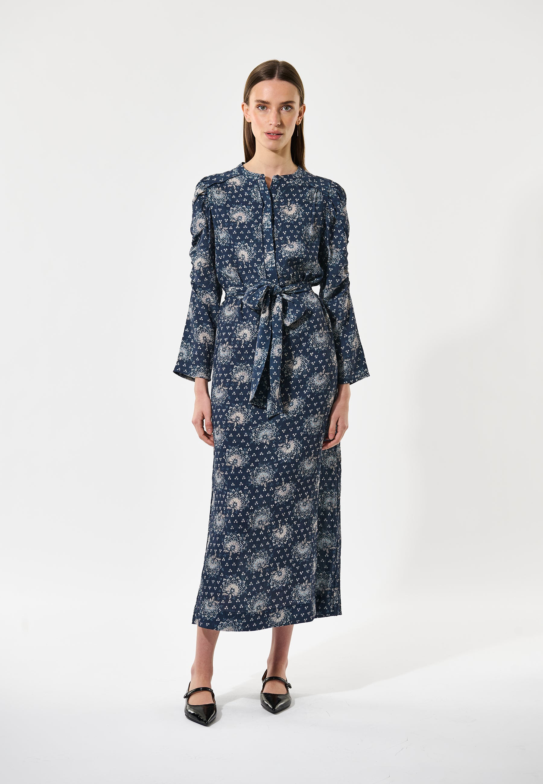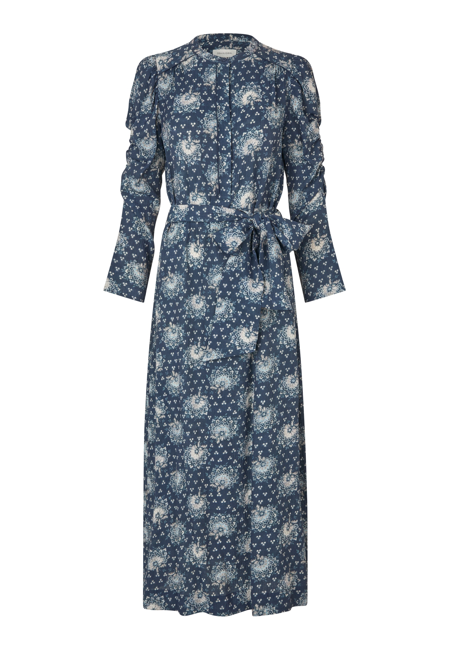 Skøn lang kjole i crepe viscose. Kjolen har fine pipping detaljer fortil og på bærestykke, en enkel rund halsudskæring, stolpelukning med skjulte knapper, bærestykke og smalle ærmer med fin rynkedetalje. Til kjolen medfølger et bredt stof bindebælte.